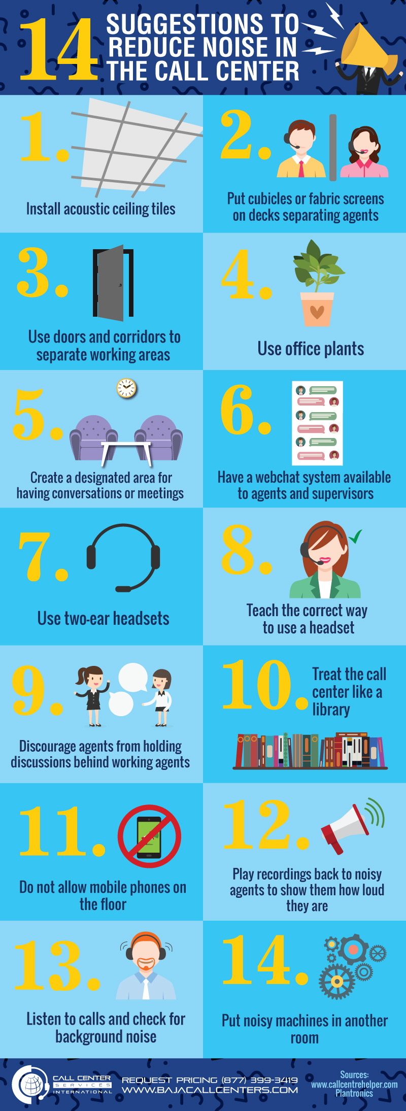 It is also harder for the agents to listen, think and give an exceptional service. In addition to this, it is important to mention that if the noise is too loud, it can also affect the health of your team. There are legal regulations on the number of decibels your employees are exposed to. For this reason, we created an infographic with 14 suggestions to help you reduce the noise at your call center.