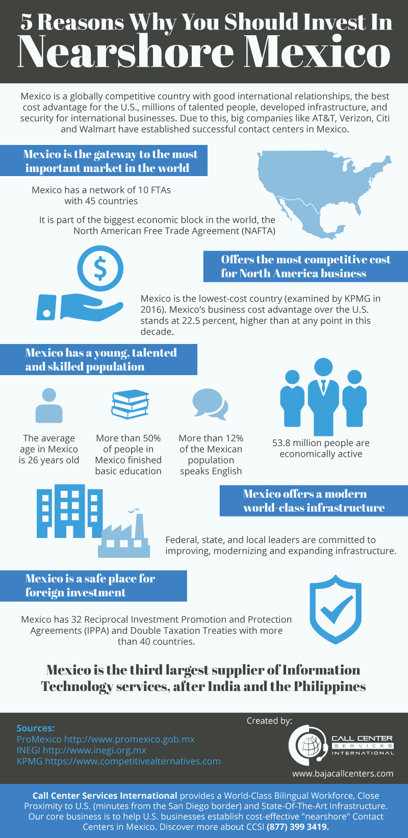 But, Mexico remains one of the favorites. This is because Mexico has great value for U.S. business when nearshoring their services. Mexico is a globally competitive country with good international relationships, the best cost advantage for the U.S., millions of talented people, developed infrastructure, and security for international businesses. Due to this, big companies like AT&T, Verizon, Citi and Walmart have established successful contact centers in Mexico. This industry keeps growing and maybe you should consider nearshoring your services to Mexico too.